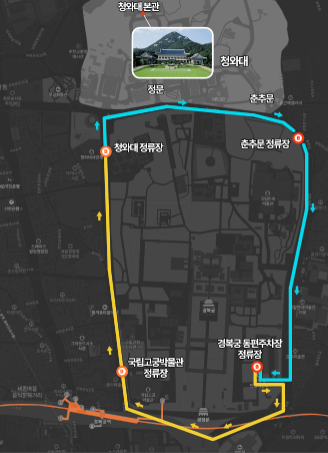 청와대 셔틀버스는 경복궁 동편 주차장, 국립고궁박물관 정류장, 청와대 정류장, 춘추문 정류장 4개 정류소를 순환하면서 운행을 하고 있습니다. 운행시간은 9시부터 오후 6시까지 30분 가격으로 운행하며 점심시간(12시 ~ 13시)에는 운영을 하지 않습니다.