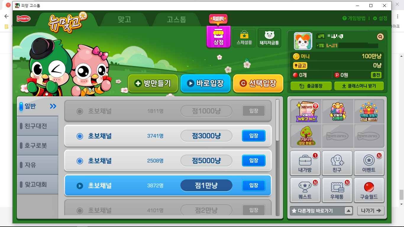입장가능한 방에 입장하여 무료 피망 뉴맞고 게임을 즐겨보세요.