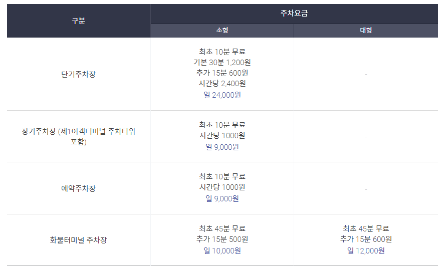 제1여객터미널: 시간당 1,000원, 일 7,000원